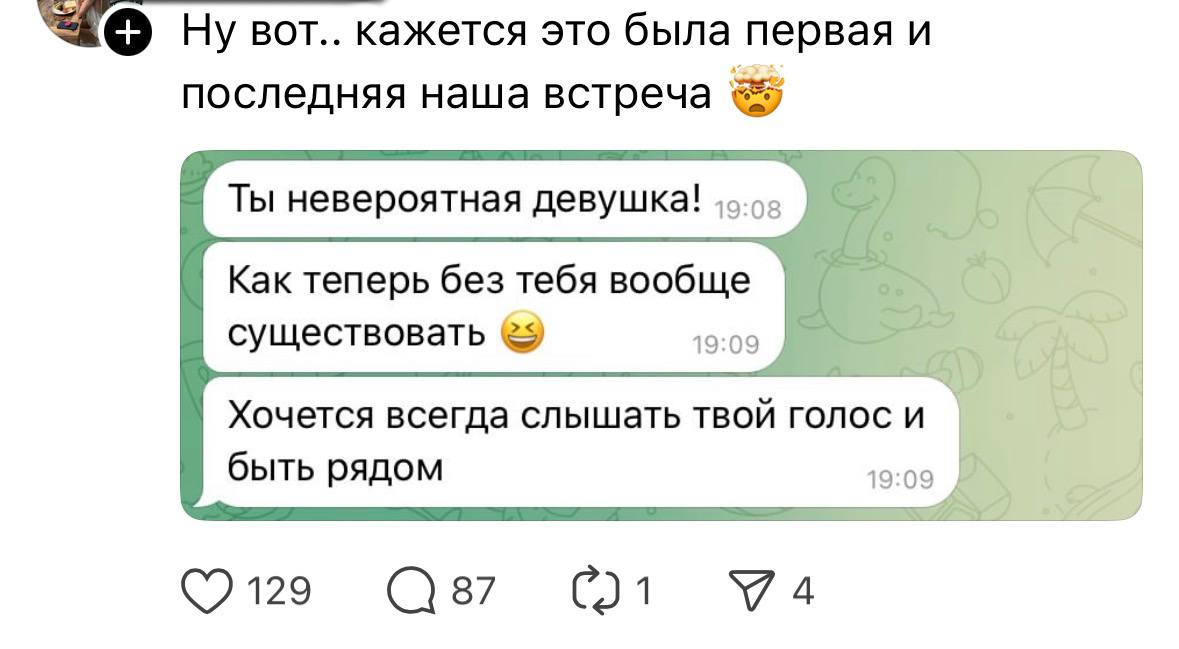 Парни, напоминаю, что подобный энтузиазм после первого свидания чаще всего будет заканчиваться скрином переписки и выставлением в соцсети на смех.